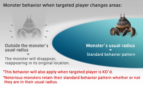 If a player is KO'd or moves to a new area while fighting a monster outside the radius that it remains within when not engaged in battle, the monster will not begin attacking others in the surrounding area. Instead, it will simply disappear.