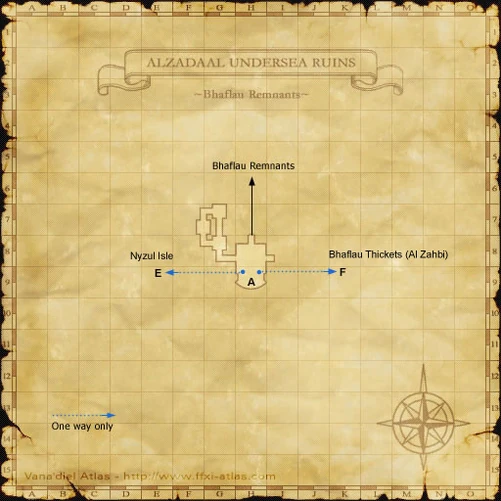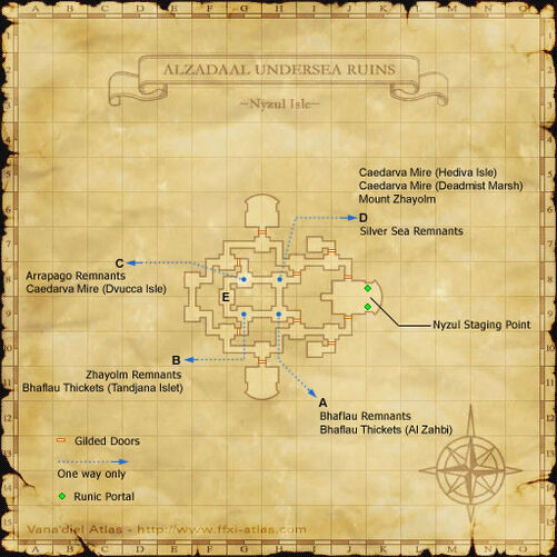 This zone exits to Arrapago Remnants: Nyzul Isle Staging Point is the hub of Alzadaal and all teleports lead to and from its map. To reach it without using the Runic Portal, head out of Al Zahbi to Bhaflau Thickets (F-6), and follow the first teleport route backwards. Imperial Silver Piece needed to enter |