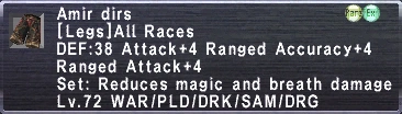 A flexible and durable set of armor, forged in the Near Eastern land of Aht Urhgan, the Amir armor set is issued by the Empire to adventurers completing various Assault missions for the nation at the cost of 20,000 Assault Points per piece. Wearable by only a few of the heavier-armored jobs, the Amir gear provides the highest stat boosts in Attack, Evasion, and Accuracy, but also provides minor boosts to other stats. Also notable is the added resistance to magic and breath damage - 8% of damage from these sources, in fact - but only if the wearer equips the entire set.