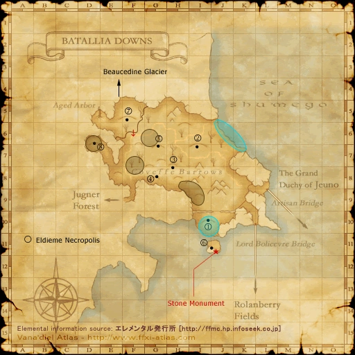 During the Great War, the Batallia Downs was the location of the famous Battle of Jeuno. The scars left from this epic confrontation still litter the region. The looming Achaque Mountains situated in the northern part of the area prevent possible intruders while hampering the travel of adventurers. Finally, the Artisan Bridge connecting the Norvallen Region and the Grand Duchy of Jeuno is located on the downs' far eastern shore. ![]() | ||||||||||||||||||||||||||||||||||||