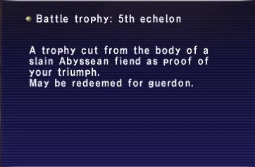 A trophy cut from from the body of a slain Abyssean fiend as proof of your triumph. May be redeemed for guerdon.