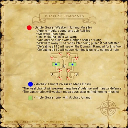 - Dormant Rampart spawned by simultaneously defeating the two triple-gear Archaic Gears from the east and west sides of the map. There are exactly two of these, one in the east room and one in the west, each among several single-gear Archaic Gear mobs. These must be defeated within approximately 5-6 seconds of each other to spawn the rampart.