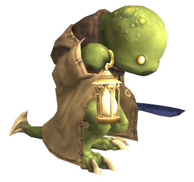 ![]() ![]() These tiny beastmen live solely in the Yhoator Jungle on the eastern half of Elshimo. The Tonberries possess a great deal of anger, or "rancor," in their hearts. It is this anger that binds them as a tribe while driving them to commit terrible acts against all other beings. During the Great War, the majority of the Tonberries remained in their strongholds, the Temple of Uggalepih and Pso'Xja. However, a few elite members of the tribe were sent to the Shadow Lord to act as his secret agents. These Tonberries would often sneak into the castles of the allied forces and assassinate important generals or political figures. Feared around Vana'diel, these beastmen were often referred to as the "invisible killers." According to the Tonberries' religion, their creator, the Goddess Uggalepih, had beauty that was envied by the Goddess Altana. A furious Altana transformed Uggalepih into a hideous beast and exiled her to the Outlands. Revenge for Altana's actions is said to be one of the origins of their rancor. Finally, the reason why they are never found without their lanterns or knives is explained in the following verses, often chanted by the Tonberries before battle: "O brothersss of rancor, take up thy lanternsss, Tonberries are most like small lizard-men in appearance, having green-colored skin, long tails, yellow eyes and a hunched appearance. In either hand each tonberry carries a weapon (club or knife) and a lantern.