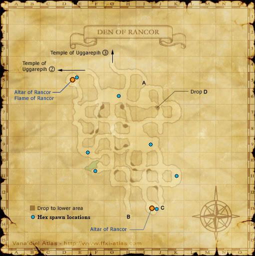 Dug by the Tonberries, this stretch of tunnel extends deep beneath the Temple of Uggalepih. It is said that the Tonberries chanted curses while digging, and that these curses still remain, embedded within the walls of the caves. Every night, the Tonberries gather here to pledge their hatred towards the five races of Vana'diel. They inflict cuts upon themselves and pour their blood onto altars, hence strengthening their rancor. ![]() | |||||||||||||||||||||||||||||||||||