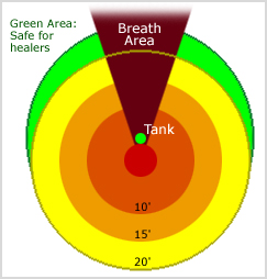 To the right is a scale diagram of a tank and a monster. Around the monster are three circles. The inner circle is the 10' radius, the middle is 15', outer is 20'. These are the three most common ranges for AoE attacks. Around the tank is one circle with radius of 20.8' which is the maximum range for Cure. As you can see, if the monster has both Cone Attack as well as 20' AoE attacks, there is only a very small area in which healers can stand (the green area) which allows them to avoid splash damage and still heal the tank.
