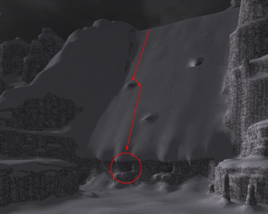 - In Uleguerand Range, slide down the south slope at F-9 and aim for the protrusion at the bottom, shown in the image to the right. Run in and follow the path until you zone into Bearclaw Pinnacle. You will see the Wind Pillar ahead and you click on this to enter the Holy Cow ENM.