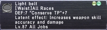 - Increases fTP multiplier by +0.1 and adds some amount of accuracy to all hits of the Weapon Skill.