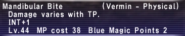 Spell cost: 38 MP Monster Type: Vermin Spell Type: Physical (Slashing) Blue Magic Points: 2 Stat Bonus: INT+1 Jobs: