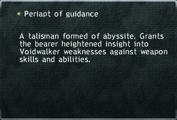 Abyssite of Discernment, this periapt allows the player to occasionally see weaknesses in Voidwatch Notorious Monsters when using weapon skills or abilities. This item only gives a vague description. A