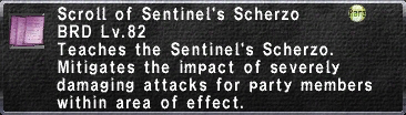 Scherzo acts as a barrier that activates against single physical or magical attacks that would take 75% or more of a target's HP, after accounting for Damage Taken- effects on gear. It reduces that damage by an amount influenced by the combined Singing and Instrument Skill of the Bard.
