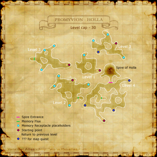 - To get to Promyvion - Holla, go to La Theine Plateau in Zulkeim using the Survival Guide or if you are a White Mage use Teleport Holla, the entry is the Shattered Telepoint (J-8), once you enter into the Hall of Transference go to the Cerment Door at the far end of the chamber and interact with it and you will be pulled into Promyvion Holla.