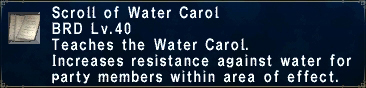 Equipment that gives "Carol +" or "All Songs +" increases the total bonus to Water resistance by +8 and duration of the song by 10% for every +1 granted.Other Uses[]