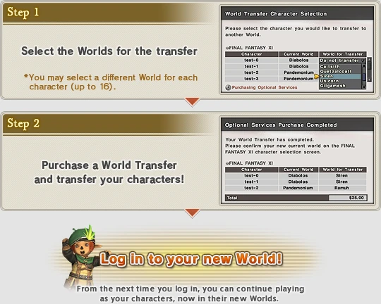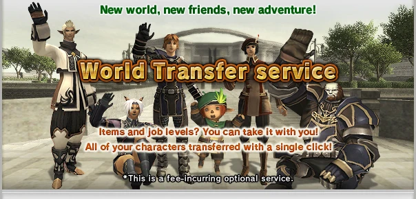 The World Transfer service is a feature that allows you to transfer your characters, including all their equipment, items, job levels, and skills, from their current World to another of your choosing. Now you can enjoy the FINAL FANTASY XI experience in any open World!